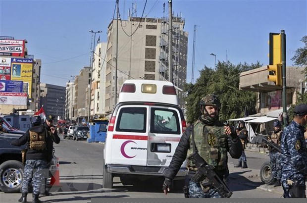 Lực lượng an ninh được triển khai tại hiện trường vụ đánh bom kép khu chợ trên quảng trường Tayaran ở trung tâm Baghdad, Iraq. (Ảnh: AFP/TTXVN)