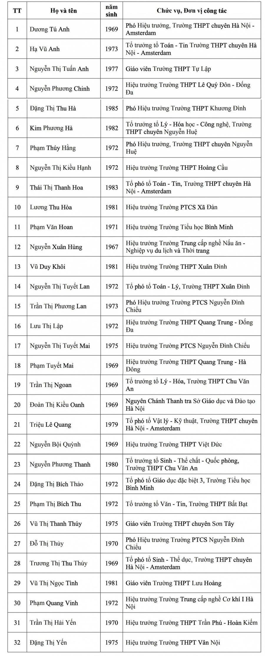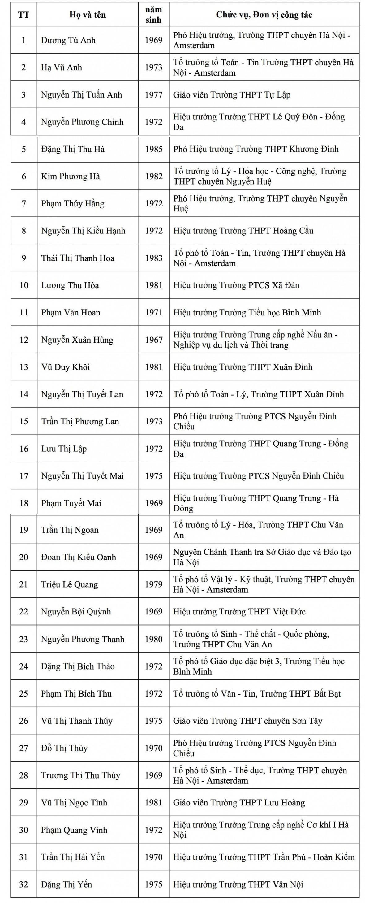 Danh sách 32 nhà giáo được đề nghị xét tặng danh hiệu “Nhà giáo ưu tú” cụ thể như sau: