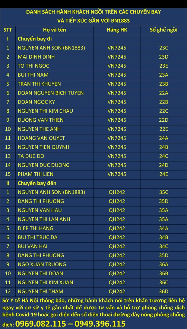 Trưa 3/2, Sở Y tế Hà Nội cung cấp danh sách những hành khách ngồi trên 2 chuyến bay có tiếp xúc gần với BN1.883.