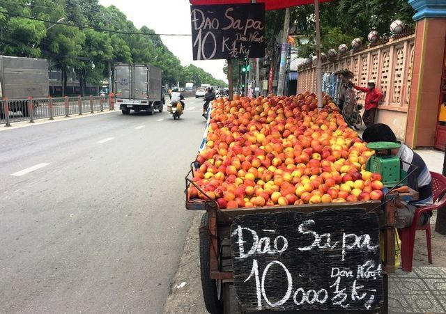 Trên đường Trường Sa, Quận 3, TP HCM một chiếc xe 3 bánh tự chế chở đầy đào dựng bên đường. Trên xe có tấm bảng “Đào Sapa”. Thấy trái đào to bất thường nên PV thắc mắc thì người bán hàng cho biết, đây là đào tiên khổng lồ, ba quả một ký. Đào có xuất xứ từ Trung Quốc, không phải đào Sapa.