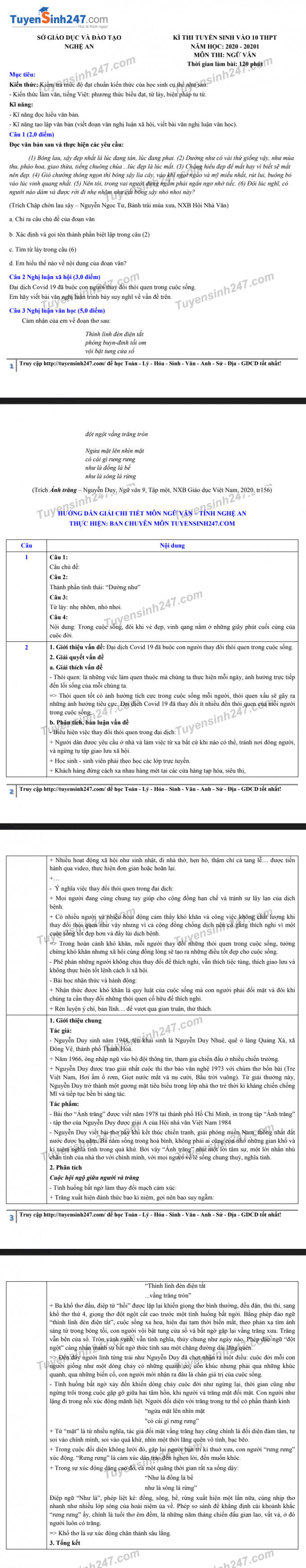 Đáp án đề thi môn Văn tuyển sinh lớp 10 tỉnh Nghệ An năm 2020. Ảnh: Tuyển sinh 247