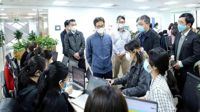 Phó Thủ tướng Vũ Đức Đam động viên các tình nguyện viên tham gia truy vết các ca nhiễm Covid-19.