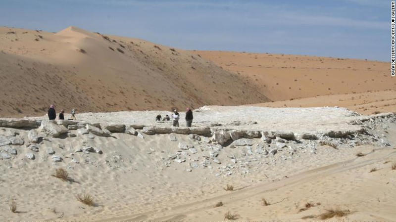 Các nhà nghiên cứu đã tìm thấy hàng trăm dấu chân hóa thạch lộ ra do xói mòn trầm tích trong quá trình khảo sát hồ cổ ở sa mạc Nefud, Ả Rập Saudi.