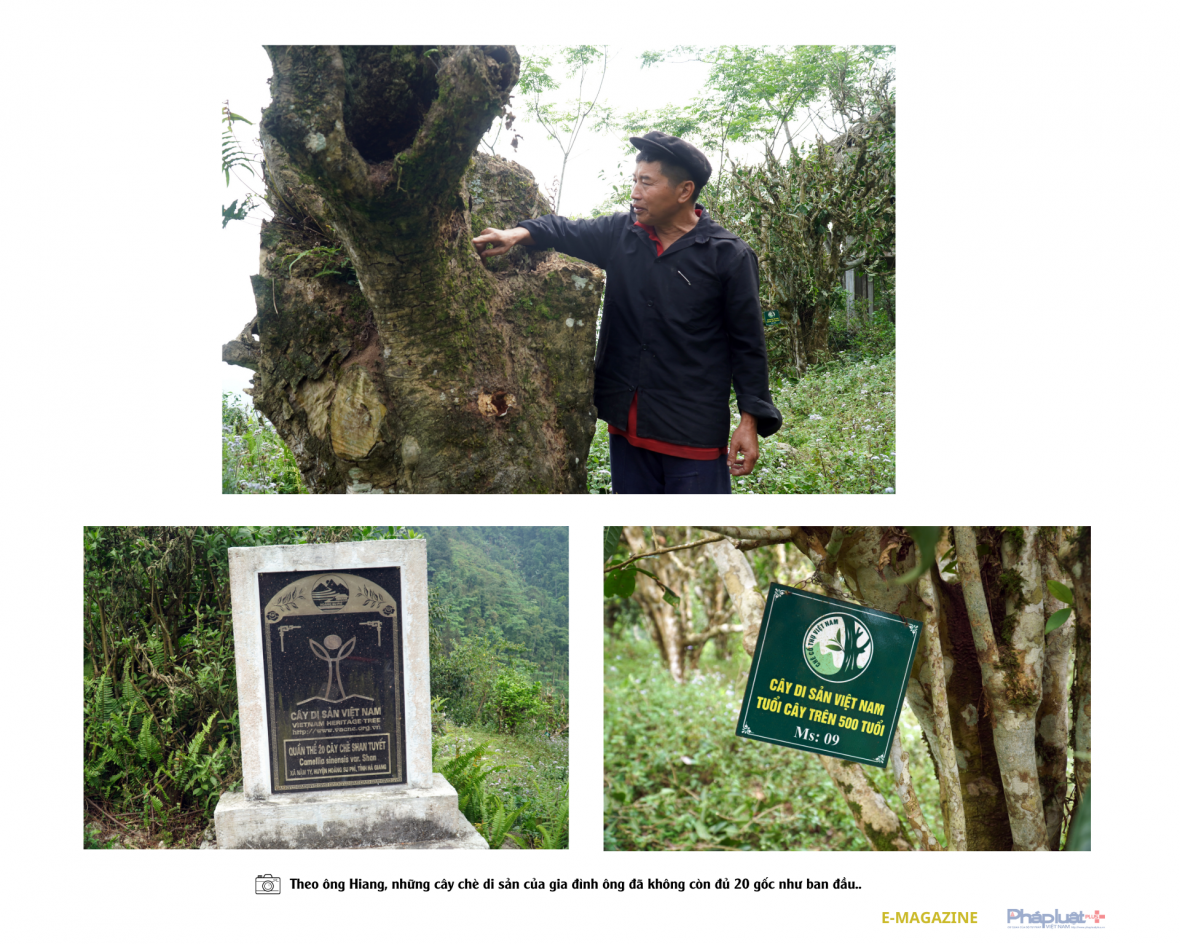 Trò chuyện một hồi xong, anh Mềnh bảo tôi ngồi lên xe máy rồi chở men theo đường mòn lên lưng chừng núi. Vừa đi, anh vừa chỉ tay và bảo rằng ở vùng này, có duy nhất vườn chè của gia đình ông Hoàng Sùn Hiang ở thôn Nậm Piên (xã Nậm Ty) được gắn biển cây chè di sản. Trên biển trước đây có ghi rõ “quần thể 20 cây chè”, nhưng thực tế giờ đây đã có nhiều cây chết, không còn đủ số lượng cây ghi trên bia nữa.