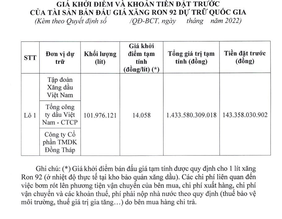 Giá khởi điểm tạm tính để xác định tiền đặt trước căn cứ theo Quyết định số 1641/QĐ-BCT ngày 27/8/2021 của Bộ Tài chính về việc giá bán tối thiểu xăng Ron 92 Dự trữ quốc gia là hơn 1.400 tỷ đồng. Tuy nhiên, mức trúng đấu giá sẽ cao hơn nhiều so với mức giá tạm tính này (giá xăng E5 ngày 21/2 là 25.530 đồng/lít).