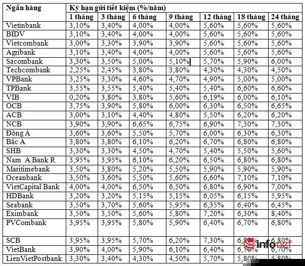Những ngân hàng có mức lãi suất huy động cao nhất như: NCB 7,30%/năm áp dụng cho kỳ gửi 18-24 tháng; SCB là 7,30%/năm áp dụng cho kỳ hạn 12 tháng tuy nhiên với điều kiện phải gửi từ 500 tỷ đồng trở lên; Oceanbank là 7,10%/năm áp dụng cho kỳ gửi 18-24 tháng; Viet Capital Bank là 7,00%/năm.