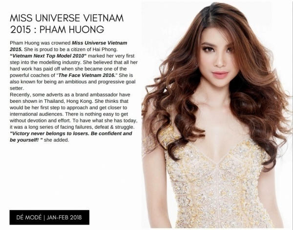 Song song đó, tạp chí Dé MoDé của Ý và Ấn Độ cũng đã có bài phỏng vấn Hoa hậu Phạm Hương và giới thiệu cô là một trong những ngôi sao giải trí hàng đầu Việt Nam trong thời điểm hiện tại. Bài viết cũng đề cập đến sở thích, công việc người mẫu và thành tích của Phạm Hương suốt thời gian qua.