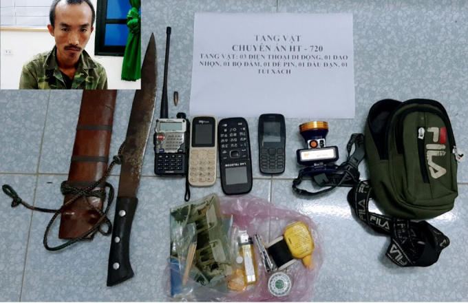 Tại hiện trường, lực lượng chức năng thu giữ 1 bộ đàm cầm tay, 3 điện thoại di động, 1 dao nhọn, 1 đầu đạn, 1 túi xách và 1 đèn pin.