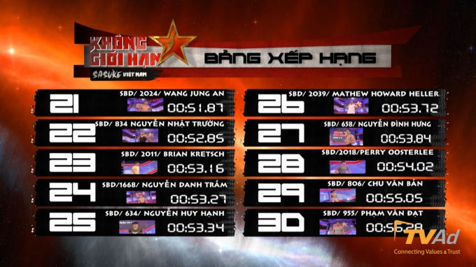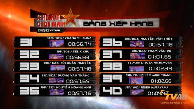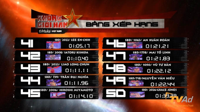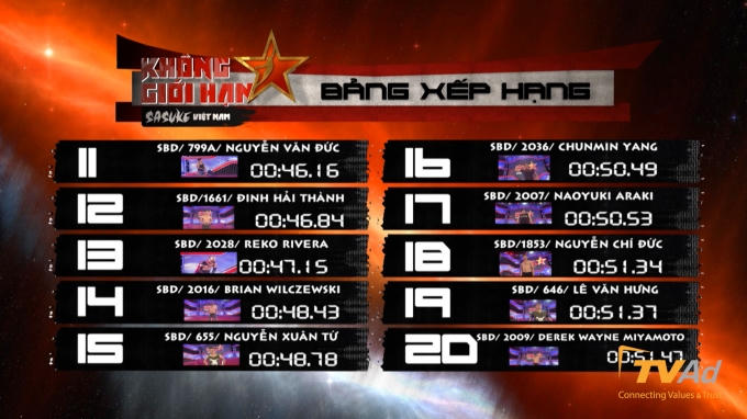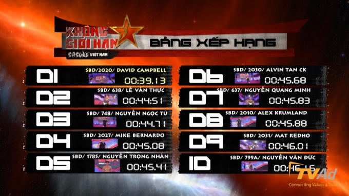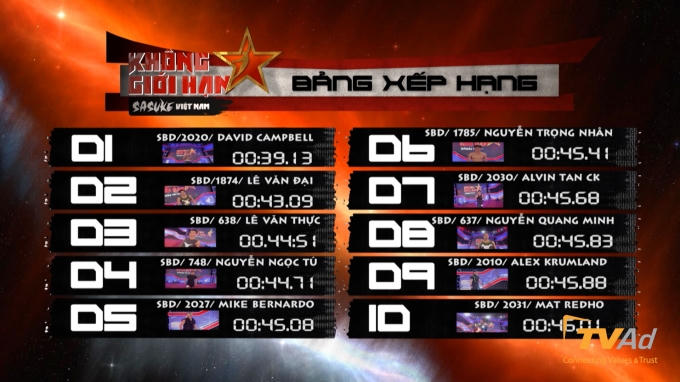 Không hổ danh là “Bố già” Sasuke, David Campbell đã độc chiếm vị trí đầu tiên của BXH. Tình yêu Sasuke có lẽ là đặc điểm chung nhất của các thí sinh tham gia chương trình và Phạm Văn Đủ cũng là một thí sinh như vậy.