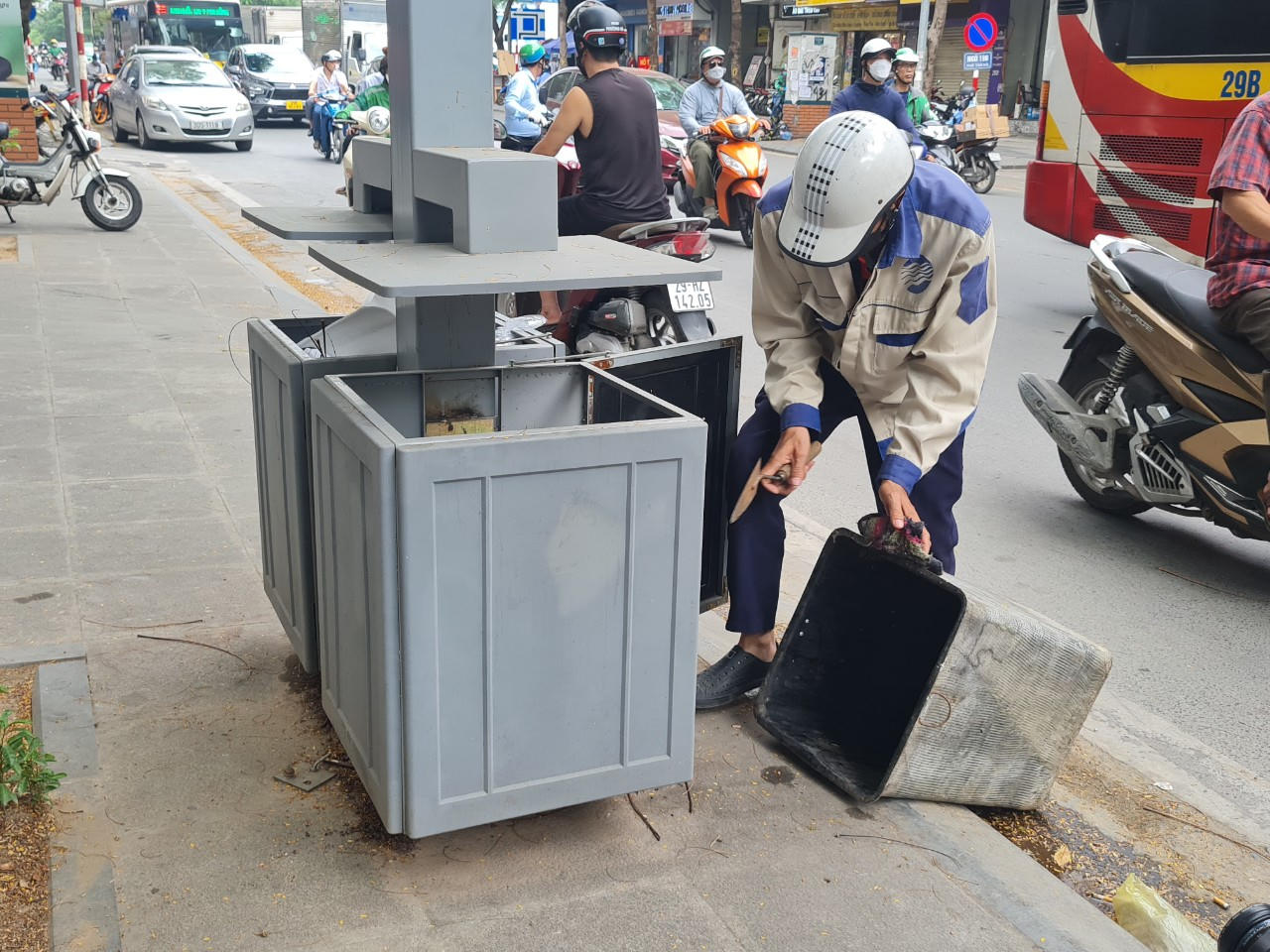 Đội ngũ công nhân tiến hành vệ sinh thùng rác định kỳ theo ngày trên các tuyến phố.