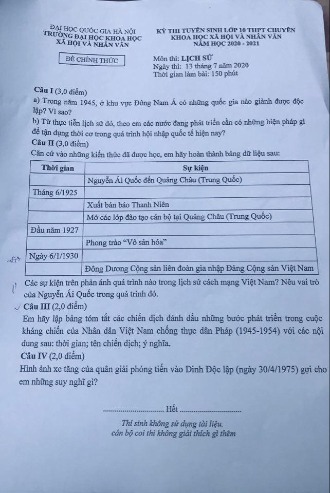 Dưới đây là đề thi môn Lịch Sử vào Trường THPT chuyên Khoa học Xã hội và Nhân văn năm 2020 (Trường ĐH KHXH & NV).