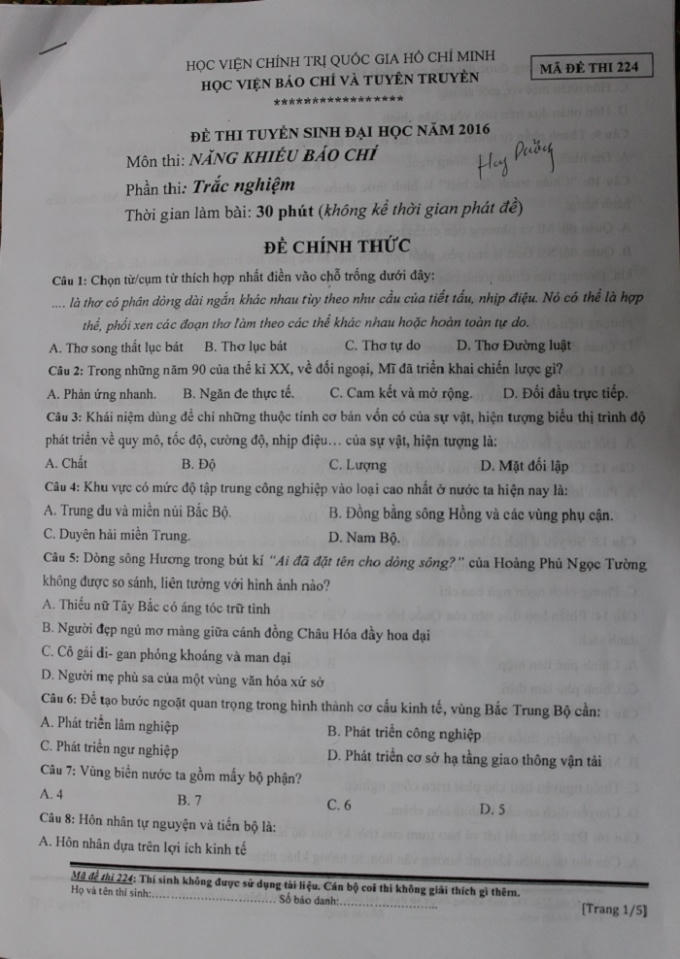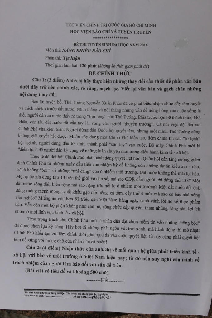 Đề thi môn Năng khiếu Báo chí 2016 Học viện Báo chí và Tuyên truyền
