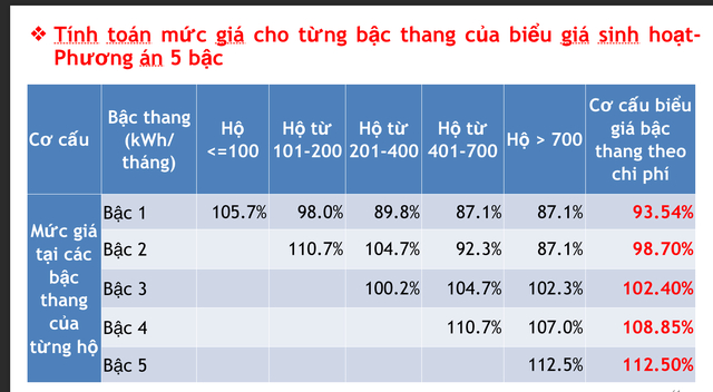 Sau khi phân tích, nhóm nghiên cứu đề xuất chọn phương án giá bán lẻ điện chia 5 bậc thang, bỏ bậc thang 50kWh đầu tiên và kéo dài bậc thang lên tới trên 700kW.