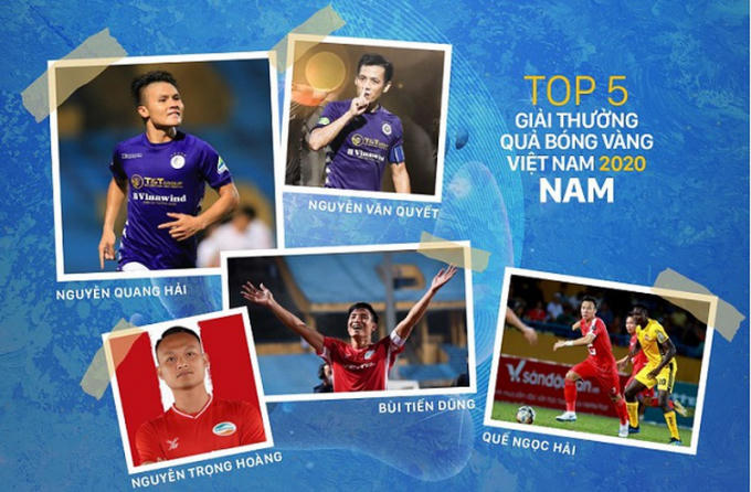 1. Tốp 5 Quả bóng vàng nam – Bùi Tiến Dũng (CLB Viettel) – Quế Ngọc Hải (CLB Viettel) – Nguyễn Quang Hải (CLB Hà Nội) – Nguyễn Trọng Hoàng (CLB Viettel) – Nguyễn Văn Quyết (CLB Hà Nội)
