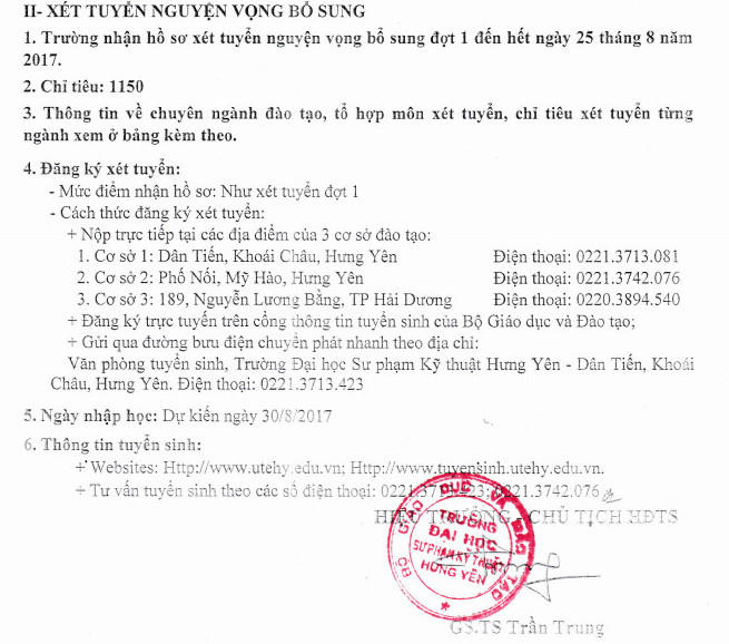 Mới đây, Trường Đại học Sư phạm Kỹ thuật Hưng Yên đã có thông báo xét tuyển nguyện vọng bổ sung đợt 1 năm 2017.