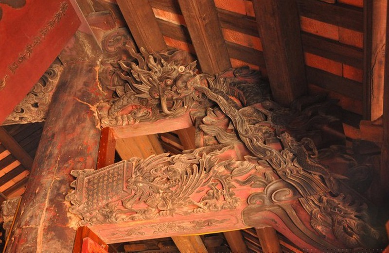 Ở các đầu bẩy phía trước được trang trí rất công phu, mỗi đầu bẩy là một đề tài trang trí. Nghệ thuật chạm khắc ở đây chủ yếu là những linh vật như rồng, phượng, chim, cá, rùa, long mã và những con vật gắn với tư duy của người Việt xưa.
