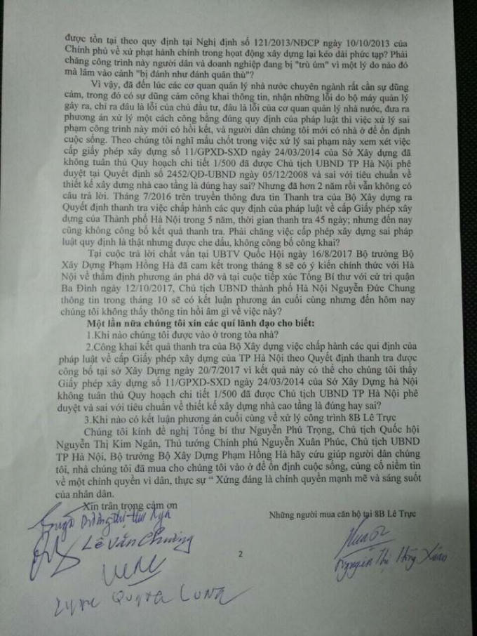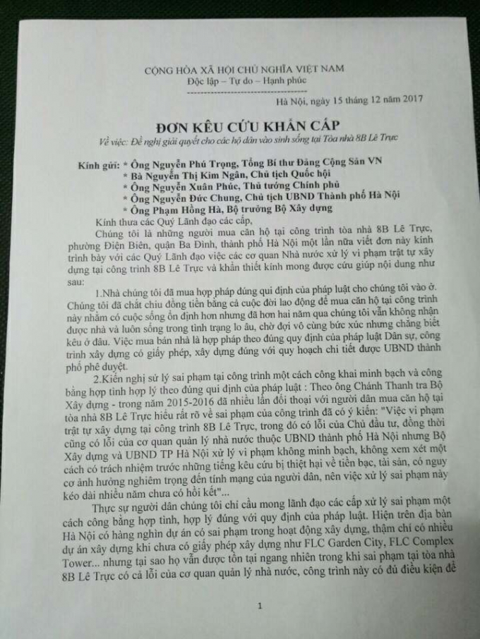 Trong đơn kêu cứu khẩn cấp gửi Tổng bí thư Nguyễn Phú Trọng, Chủ tịch Quốc hội Nguyễn Thị Kim Ngân, Thủ tướng Chính phủ Nguyễn Xuân Phúc, Chủ tịch UBND TP Hà Nội Nguyễn Đức Trung và Bộ trưởng Bộ Xây dựng Phạm Hồng Hà, cư dân 8B Lê Trực tiếp tục khẳng định: “Nhà chúng tôi đã mua bằng giao dịch hợp pháp, đúng quy định của Pháp luật. Chúng tôi đã chắt chiu công sức lao động cả đời để mua nhà, những mong có cuộc sống tốt đẹp hơn.