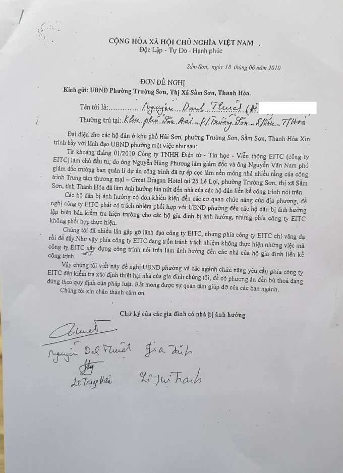Thanh Hóa: Công trình Great Dragon Hotel xây dựng gây nứt nhà, người dân gửi đơn kêu cứu?