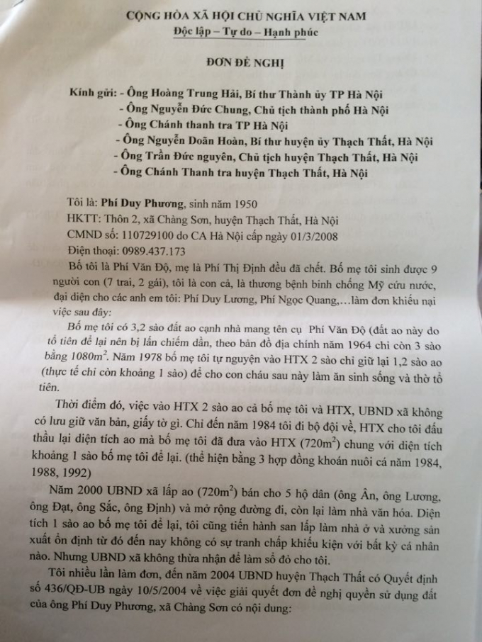 Tòa soạn Phapluatplus.vn nhận được đơn kêu cứu khẩn cấp của ông Phí Duy Phương và ông Phí Ngọc Quang cùng trú tại thôn 2, xã Chàng Sơn, huyện Thạch Thất, Hà Nội.