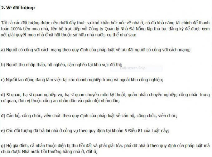 Tất cả các đối tượng được nêu dưới đây thực sự khó khăn bức xúc về nhà ở, có đủ khả năng tài chính để thanh toán 100% tiền mua nhà, liên hệ trực tiếp với Công ty Quản lý Nhà Đà Nẵng lập thủ tục đăng ký để được xem xét giải quyết mua nhà ở xã hội thuộc sở hữu nhà nước.