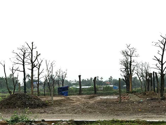 Theo ghi nhận của PV, khu đất khoảng 1.000 m2 vốn là đất ruộng của người dân mới đây đã được đổ đất, cát san gạt tạo lập mặt bằng. Trên khu đất, hàng loạt cây to dạng cổ thụ đã được trồng xung quanh tựa như một dự án sinh thái. Phía ngoài gần mép đường, một hàng rào dây thép đang được dựng lên.