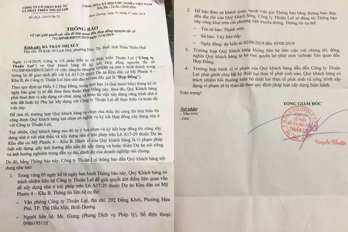 Theo đó, văn bản cho biết, theo quy định trong hợp đồng thì kể từ ngày bàn giao vị trí đất, khách hàng phải thuê đơn vị xây dựng có chức năng và hoàn tất việc xây dựng nhà ở trên đất hoặc ký Phụ lục xây dựng với Công ty Thuận Lợi để thực hiện. Trường hợp khách hàng tự chọn nhà thầu thi công thì đơn vị này có nghĩa vụ ký hợp đồng xây dựng với Công ty Thuận Lợi.