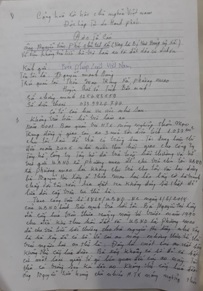Cụ thể, trong đơn ông cho biết: Năm 2001 tôi làm đơn xin Ban quản trị HTX nông nghiệp thôn mao Trung, xã Phượng Mao làm ao thả cá và được Ban quản trị HTX thống nhất giao cho tôi ao 3 mô với diện tích là 1.039 m2.