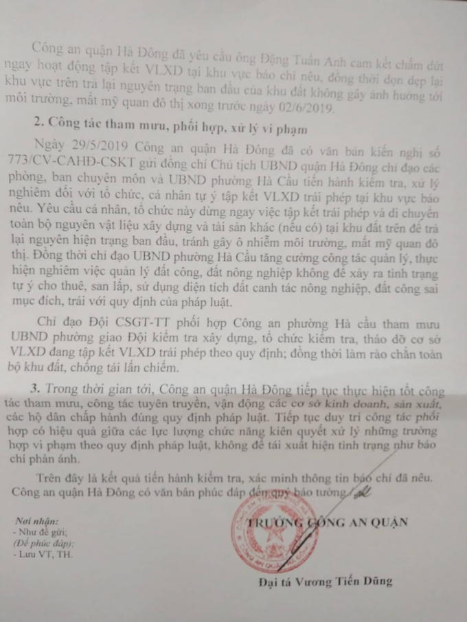 Văn bản do Đại tá Vương Tiến Dũng – Trưởng công an quận ký. Trong Văn bản nêu rõ, ngay sau khi nhận được phiếu giao việc của đồng chí Giám đốc CA TP Hà Nội, Trưởng CA quận Hà Đông đã có Phiếu giao việc số 377/PGV-CAHĐ-TH, ngày 24/5/2019 chỉ đạo đội CSĐTTP về TTQLKT&CV, đội CSGT-TT, Công an phường Hà Cầu tiến hành kiểm tra xác minh, tham mưu xử lý tình trạng báo nêu.