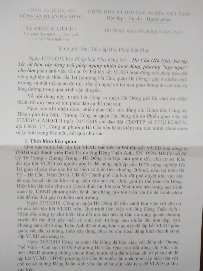 Trước thông tin phản ánh trên, mới đây ngày 3/6/2019, Công an quận Hà Đông đã ra văn bản số 430/BC-CAHĐ-TH phản hồi Pháp luật Plus.