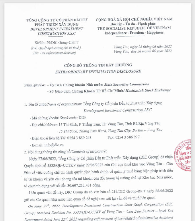 Tổng công ty cổ phần Đầu tư phát triển xây dựng (DIC Corp - Mã: DIG) cho biết ngày 27/6 đã nhận được quyết định của Chi cục thuế khu vực Vũng Tàu - Côn Đảo về việc cưỡng chế thi hành quyết định hành chính về quản lý thuế bằng biện pháp trích tiền từ tài khoản và yêu cầu phong tỏa tài khoản của đối tượng bị cưỡng chế tại Kho bạc Nhà nước, tổ chức tín dụng với số tiền hơn 30,6 tỷ đồng.