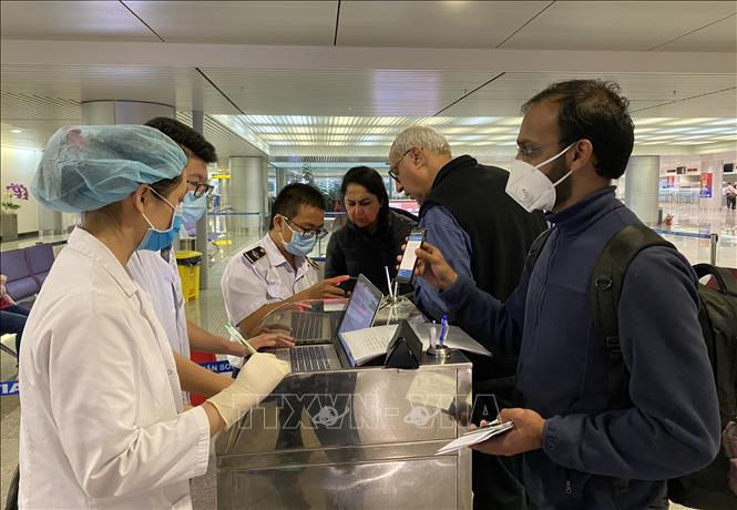 Nhân viên Trung tâm Kiểm dịch y tế quốc tế hướng dẫn hành khách thực hiện tờ khai y tế trước khi làm thủ tục nhập cảnh tại sân bay Tân Sơn Nhất. Ảnh: TTXVN phát