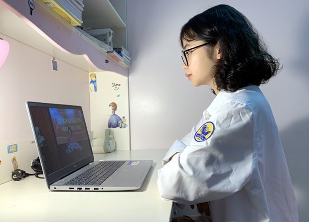 Học sinh Trường trung học phổ thông Vĩnh Yên học trực tuyến. (Nguồn: vinhphuc.gov.vn)