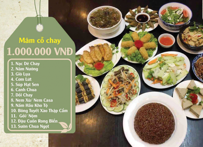 Thực dưỡng Homefood đã giới thiệu 6 mâm cỗ chay khác nhau mang tên gọi Tri Ân, Đoàn Viên, An Yên, Đại Cát… bao gồm từ 6 đến 11 món chay, có giá từ 600.000 đồng đến 1.500.000 đồng. Nhà hàng Chay Vị Lai cũng giới thiệu 5 mâm cỗ chay, với mức giá từ 585.000 đồng đến 1.040.000 đồng để khách hàng lựa chọn.