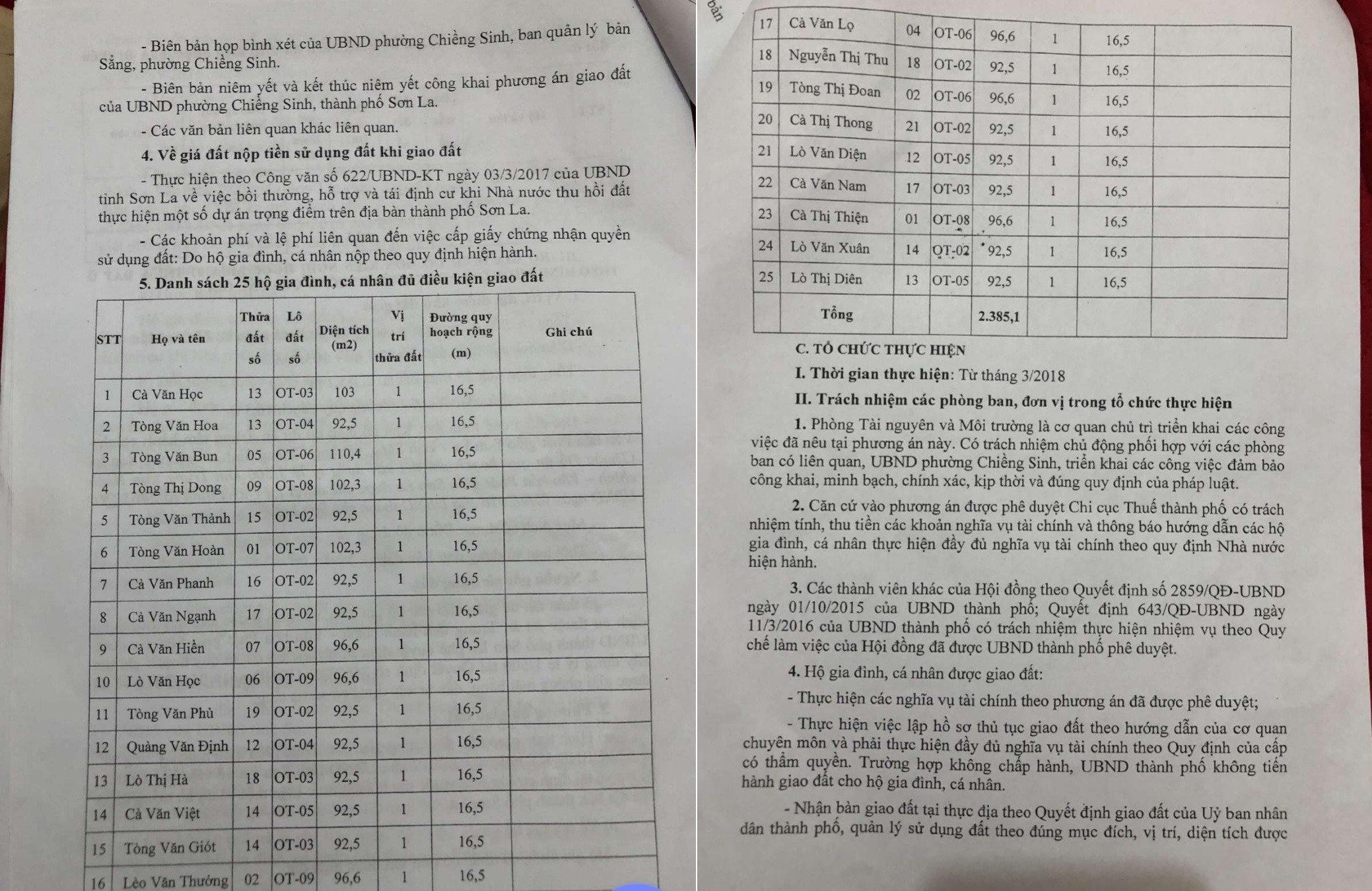 Tại Quyết định số 649/QĐ-UBND ngày 02/8/2018 của UBND TP Sơn La về việc phê duyệt phương án giao đất có thu tiền sử dụng đất cho các hộ gia đình, cá nhân bị thu hồi đất thuộc dự án Trung tâm hành chính văn hóa Phật giáo tỉnh Sơn La có danh sách 25 hộ gia đình, cá nhân đủ điều kiện giao đất là những gia đình có đơn kiến nghị được mua 01 thửa đất ở theo hình thức giao đất không thông qua đấu giá.