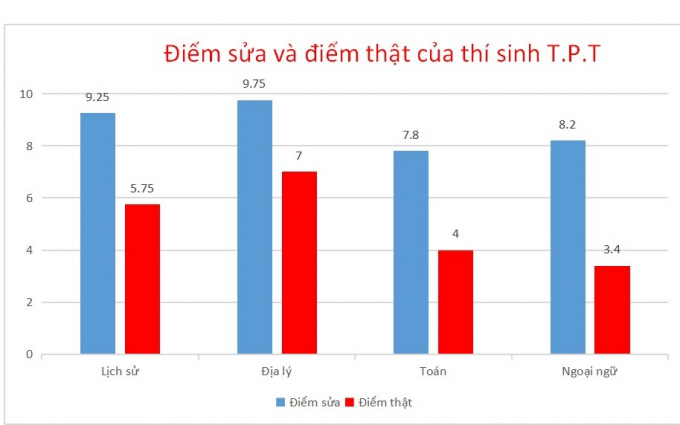 Tuy nhiên, khi Bộ GDĐT chấm thẩm định, điểm thật của thí sinh này chỉ còn: Sử 5,75 điểm, Địa lý 7 điểm.