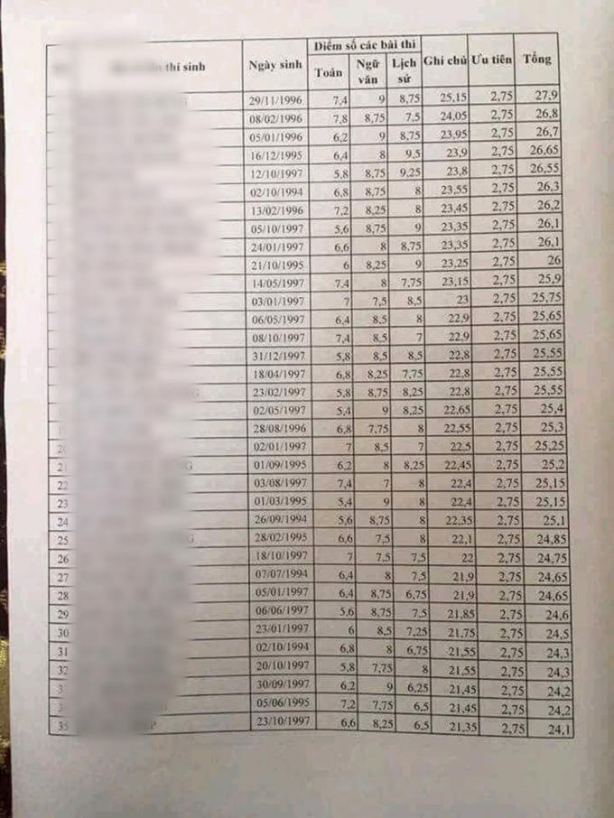 Tổng 3 môn thi Ngữ Văn, Toán, Lịch sử và điểm ưu tiên của 35 thí sinh trong bảng nêu trên không có thí sinh nào dưới 24 điểm. Cao nhất là N.V.D (29/11/1996) với tổng điểm 27,9 điểm – Môn Toán (7,4); Môn Ngữ Văn (9); Môn Lịch sử (8.75) điểm ưu tiên là 2,75. Đứng thứ 2 là, N.V.L (8/2/1996) với tổng điểm 26,8 – Môn Toán (7,8); Môn Ngữ Văn (8,75); Môn Lịch sử (7,5), điểm ưu tiên là 2,75…