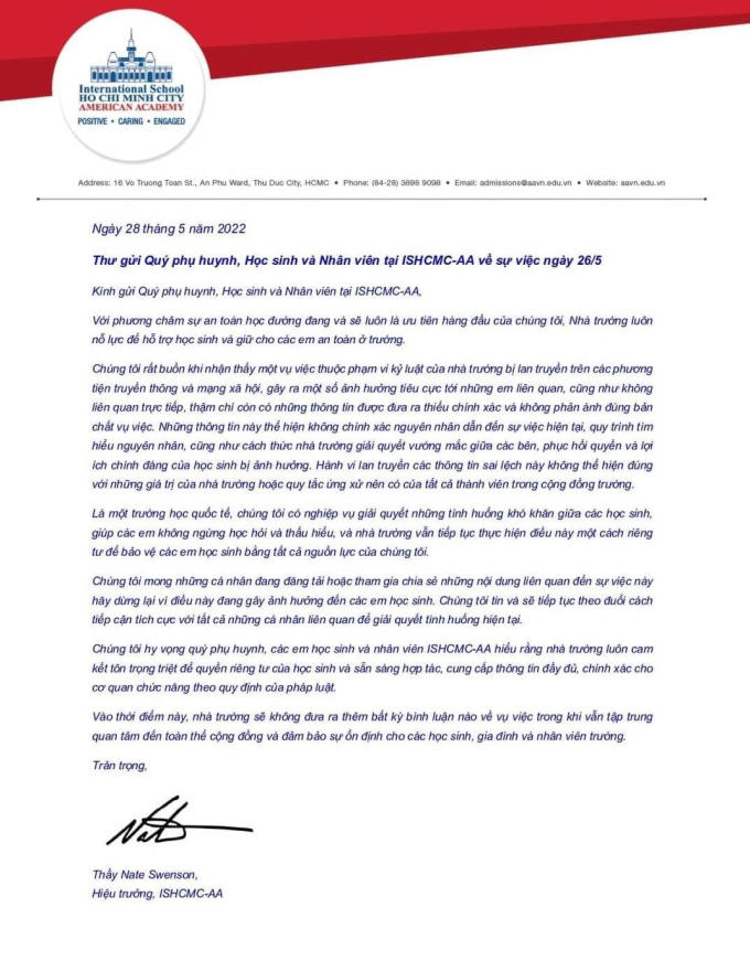 Diễn biến mới vụ việc bạo lực học đường tại trường quốc tế American Academy (ISHCMC-AA)