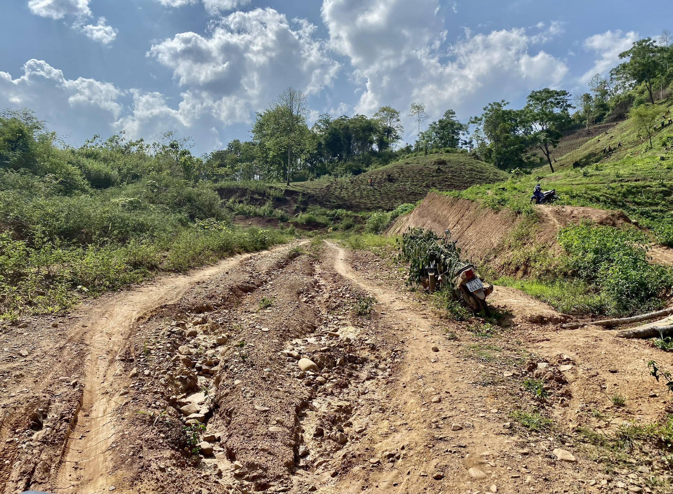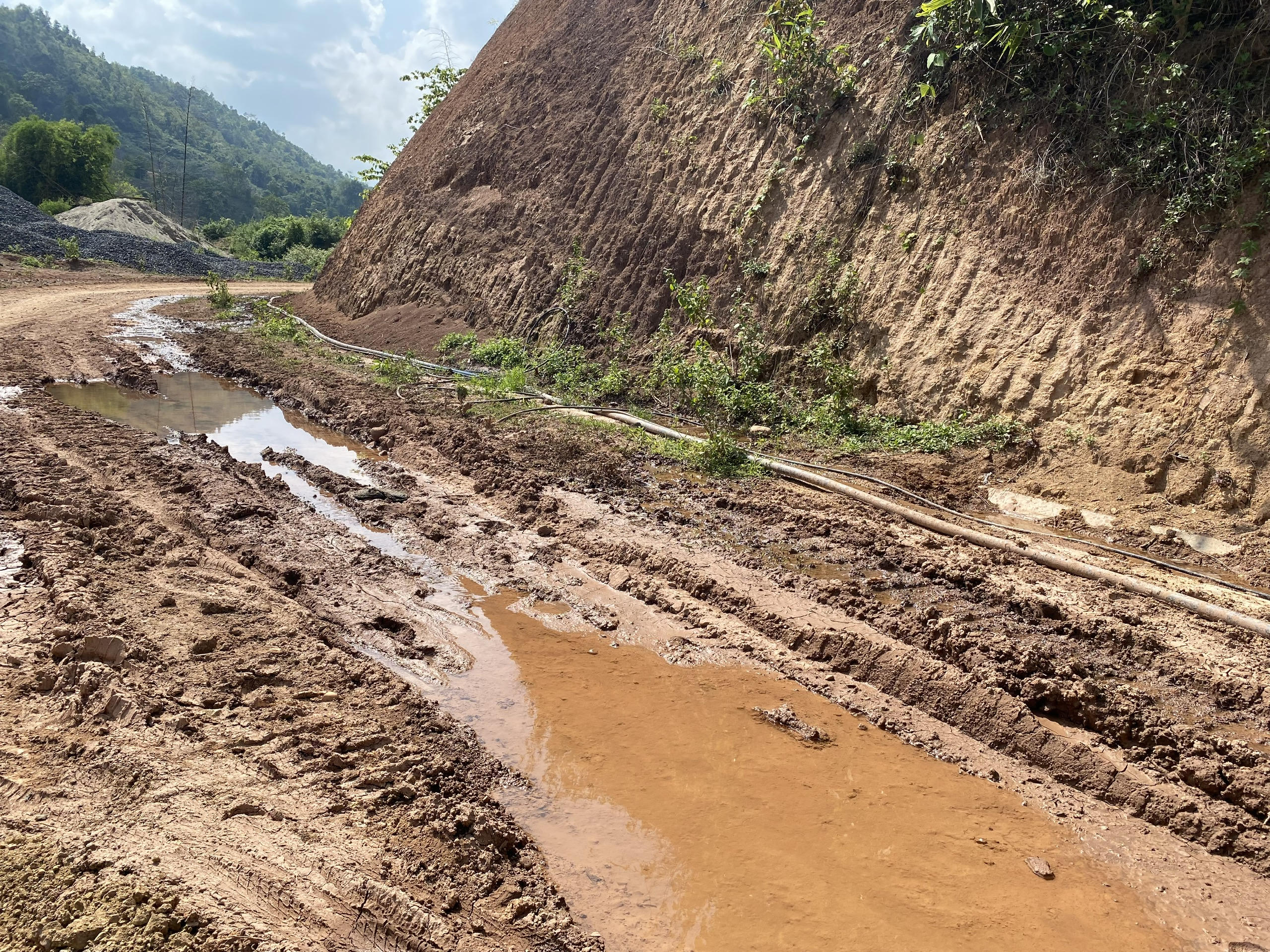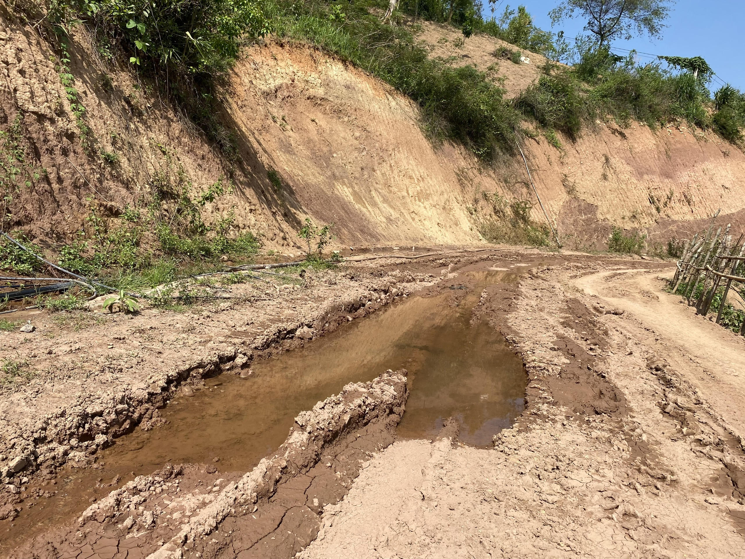 Mặt đường bị nước xói mòn thành cách rãnh lớn.
