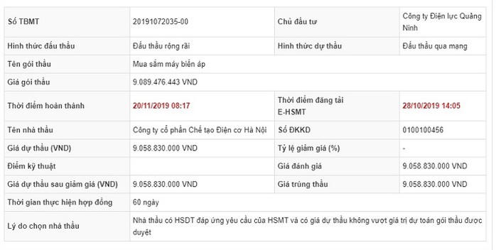 Thông báo đấu thầu gói thầu mua sắm máy biến áp của Công ty Điện lực Quảng ninh. Đơn vị trúng thầu là Công ty cổ phần chế tạo Điện cơ Hà Nội.