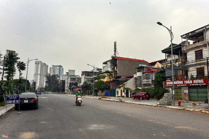 Đoạn đường cạnh ngõ 14 phố Pháo Đài Láng đã hoàn thành lát đá vỉa hè, trồng cây xanh lòng đường được trải nhựa, nhưng nhiều nhà dân vẫn chưa được giải phóng mặt bằng.