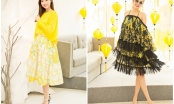 Cùng là sự kết hợp hai tông vàng, trắng, Lệ Hằng lại trông thanh lịch hơn với thiết kế phom rộng, tay áo loe phủ cầu vai. Độ ngắn vừa phải của chiếc váy giúp trông năng động, trẻ trung vừa khoe được đôi chân dài, thẳng của Á hậu Hoàn vũ Việt Nam 2015.