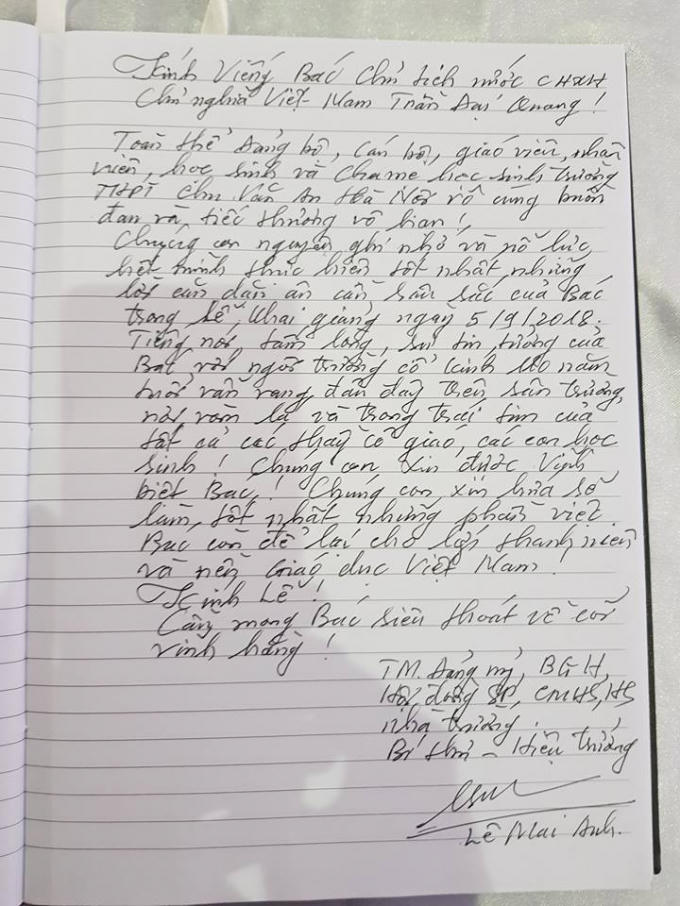 Lễ viếng Chủ tịch nước bắt đầu lúc 7h sáng qua. Đến buổi chiều, 800 giáo viên, học sinh, phụ huynh của Trường THPT Chu Văn An (Hà Nội), ngôi trường vừa vinh dự được Chủ tịch nước đánh trống khai giảng ngày 5/9 vừa qua đã có mặt. Đây là đoàn có số thành viên đông nhất trong cả lễ viếng Chủ tịch nước.