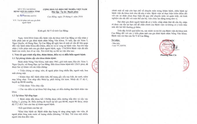 Liên quan đến vụ việc nghiêm trọng này, lãnh đạo sở Y tế tỉnh Cao Bằng cho biết, phía bệnh viện đã xử lí và thu giấy phép hành nghề và tạm đình chỉ đối với bác sĩ ca trực này. Bệnh viện cũng đã xử lý y tá điều dưỡng và kỹ thuật tắc trách trong ca trực này.