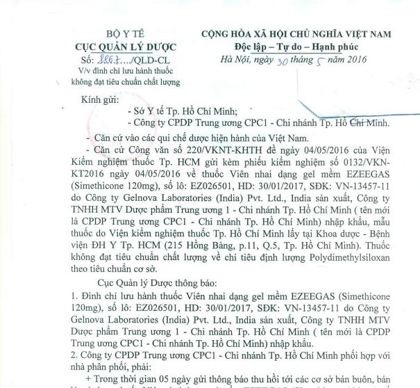 Theo công văn số 8867/QLD-VP ngày 30/5/2016 của Cục Quản lý Dược (Bộ Y tế) về việc đình chỉ lưu hành thuốc Viên nhai dạng gel mềm EZEGAS (Simethicone 120mg), số lô: EZ026501, HD: 30/01/2017, SĐK: VN-13457-11 do Công ty Gelnova Laboratories (India) Pvt. Ltd., India sản xuất, Công ty TNHH MTV Dược phẩm Trung ương 1 - Chi nhánh Tp. Hồ Chí Minh (tên mới là CPDP Trung ương CPC1 - Chi nhánh Tp. Hồ Chí Minh) nhập khẩu bị Cục Quản lý Dược đình chỉ lưu hành là do thuốc không đạt tiêu chuẩn chất lượng về chỉ tiêu định lượng Polydimethylsiloxan theo tiêu chuẩn cơ sở.