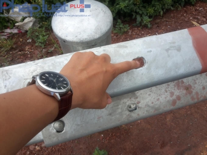 Đặc biệt, có những khu vực, đoạn hộ lan nối với thân trụ cắm xuống đường có 6 lỗ để gắn đinh ốc thì có đến 4 lỗ không còn ốc, chỉ trơ trọi lại một đinh ốc được bắt gắn vào hộ lan và thân trụ cắm xuống nền đường cao tốc.