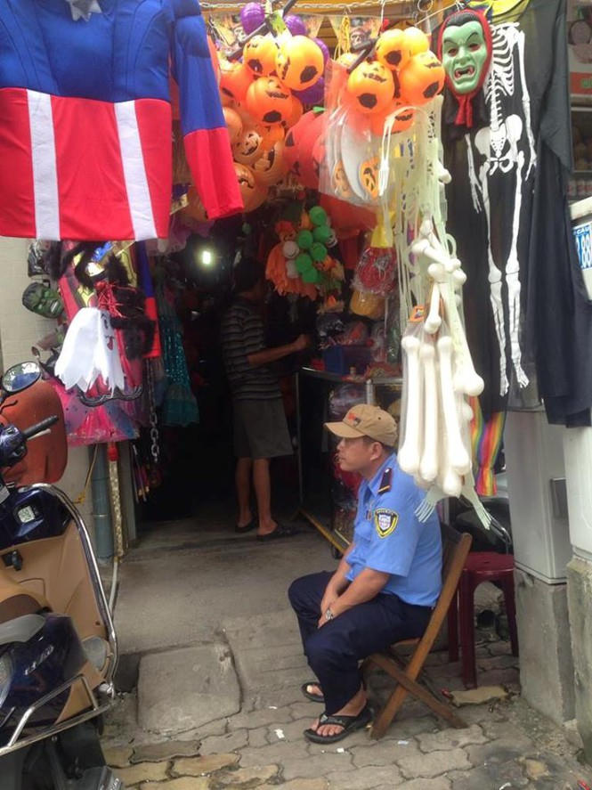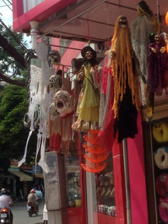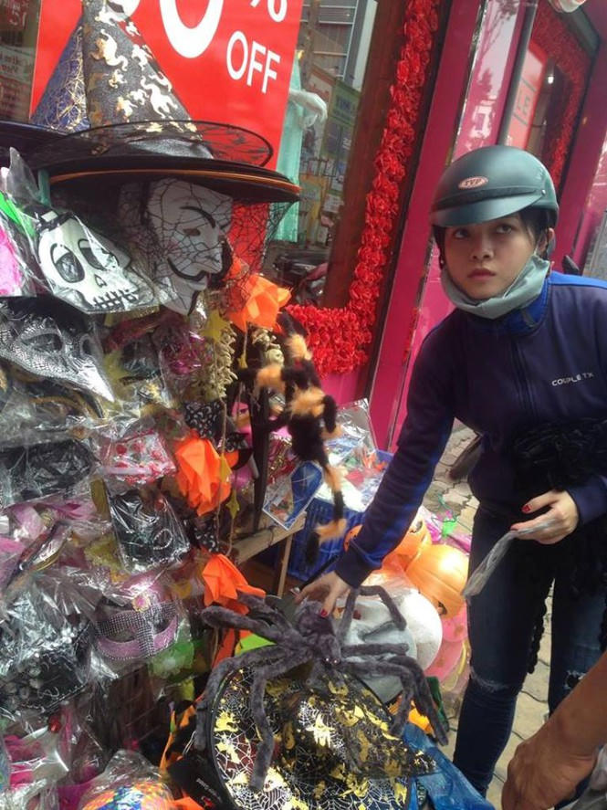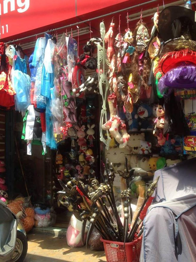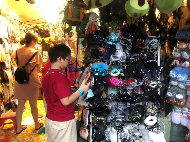 Một cửa hàng bày tận ra lối đi bộ để thu hút khách. Chỉ cần dừng xe trên vỉa hè là có thể lựa chọn thoải mái. Anh Hùng (kinh doanh đồ Halloween trên đường Nguyễn Văn Luông, Q.6) cho biết: "Hàng bán chạy nhất là mặt nạ quỷ sứ, kiếm phát sáng. Giá trọn gói từ quần áo, đao kiếm, máu giả, răng giả... khoảng từ 1,5 triệu đồng. Mỗi năm có 1 dịp này thôi nên hầu như không ai chế đắt rẻ".