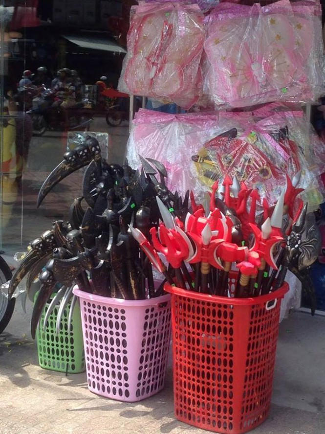 Những loại đồ chơi bạo lực như đao, kiếm, búa... cũng được ưa chuộng. Đa số đều là hàng Trung Quốc. Tuy nhiên không ai quan tâm đến xuất xứ, món hàng càng quái, càng kinh dị càng đắt hàng...