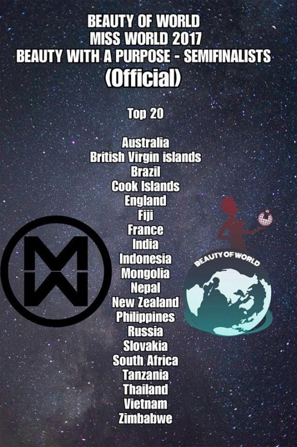 Danh sách này được công bố sau khi ban giám khảo xem xét, đánh giá những dự án xã hội và từ thiện của các người đẹp được giới thiệu trong những đoạn clip mà họ mang tới cuộc thi Hoa hậu Thế giới 2017.