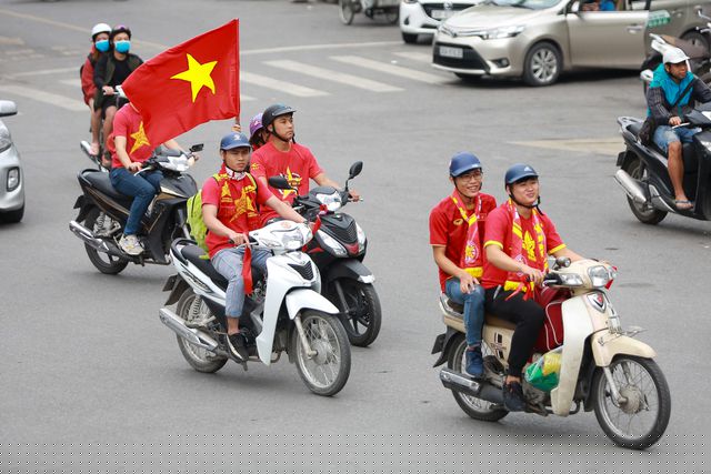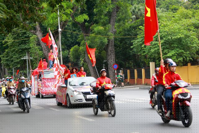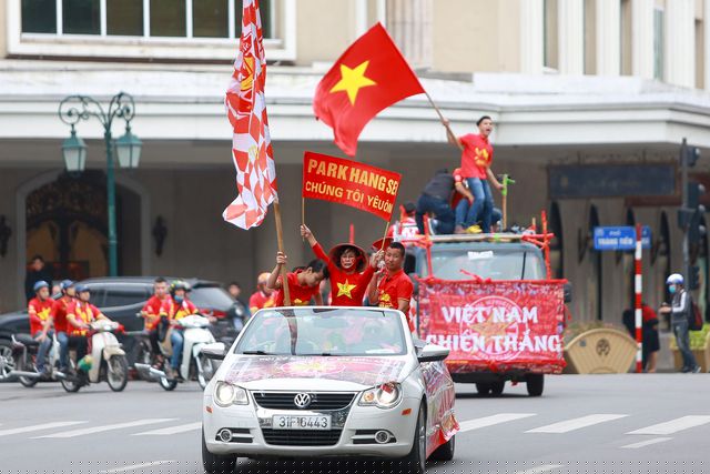 Đoàn cổ động viên với xe diễu hành với cả ô tô và xe máy, trên tay là lá cờ Tổ quốc đi khắp các tuyến đường. Các CĐV không ngại ngần thể hiện tình cảm với HLV Park Hang Seo.