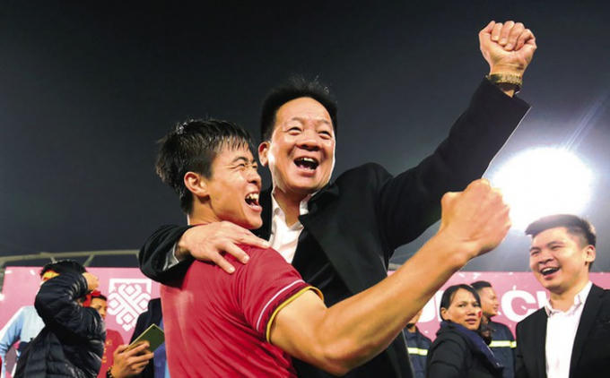 Chủ tịch HĐQT kiêm TGĐ Tập đoàn T&T Group Đỗ Quang Hiển cùng tuyển thủ Duy Mạnh ăn mừng chức vô địch AFF Cup 2018.